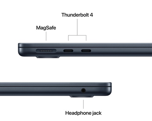 CONNECT IT ALL — MacBook Air features two Thunderbolt 4 ports, a MagSafe charging port, a headphone jack, Wi-Fi 6E and Bluetooth 5.3. 4 And it supports up to two external displays.